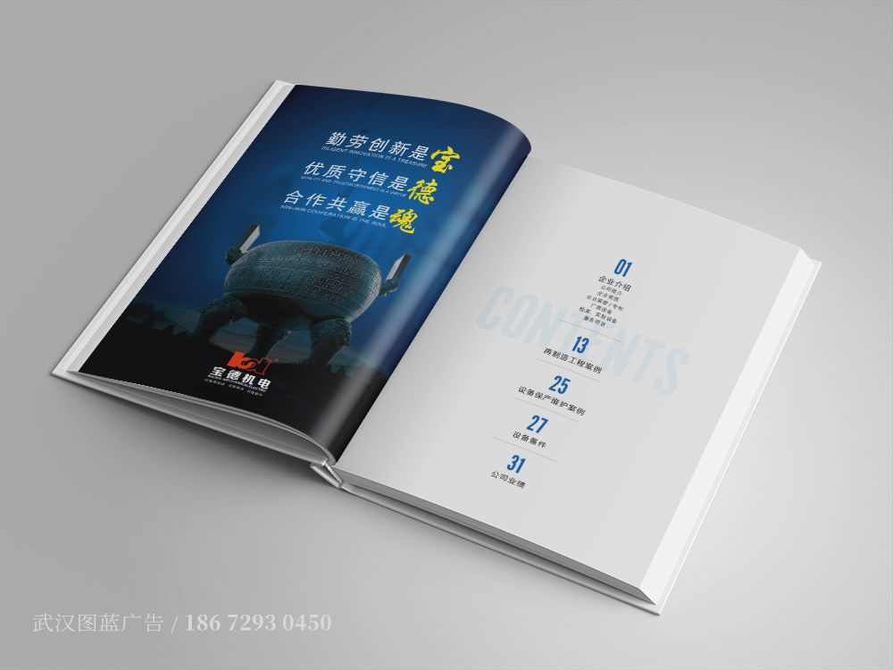 寶德機(jī)電(diàn)是(shì)圖藍(lán)廣告的(de)最老(lǎo)客戶之一(yī),從(cóng)圖藍(×lán)剛成立那(nà)年(nián)就(jiù)開(kāi)始了(le)合作(zuò),至今已經是(shì)第三本宣✔傳冊了(le),本次改版升級,圖藍(lán)為(wèi)客戶從(cóng)封面到(dào)內(nèi)頁打造了(le)全新的(de)風(fēng)格,封面設計(jì)至簡的(de)原則,在後期印刷工(gōng)藝上(shàng)做(z$uò)文(wén)章(zhāng),采用(yòng)白(bái)珠光(guāng)紙(zhǐ)印刷,logo一(yī)半實心燙✔紅(hóng)金(jīn)一(yī)半留白(bái)隻燙邊線,立體(tǐ)感躍然紙(zhǐ)上(shàng),下(xià)面把logo用(yòng)線條勾勒出立體(tǐ)和(hé)厚實 感,再配上(shàng)線條UV白(bái)金(jīn),效果也(yě)是(shì)杠杠的(de)。內(nèi)頁以深藍(lán)色調為£(wèi)主,給人(rén)沉穩、深厚的(de)印象,符合寶德機(jī)電(diàn)的(de)發展曆程和(hé)企業(yè)的(de)文(wén)化(huà)底蘊,客戶拿(ná)到<(dào)畫(huà)冊之後,稱贊到(dào):這(zhè)次确實是(shì)華麗(lì)的(de)蛻變,更新換代了(le)呀!客戶的(de)滿意,就(jiù)π是(shì)我們圖藍(lán)的(de)追求,做(zuò)畫(huà)冊設計(jì),我們是(shì)認真的(de)!